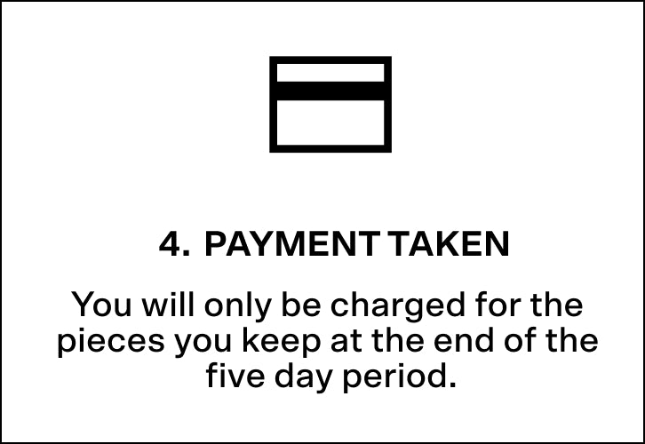 For the Try Before You buy service, the delivery charge will be taken within the Harper checkout. At the end of the try on period, we will charge your card for the pieces you decide to keep (those that have not been returned within the period). Payment will be taken from the same card which was used to pay for delivery of your items.