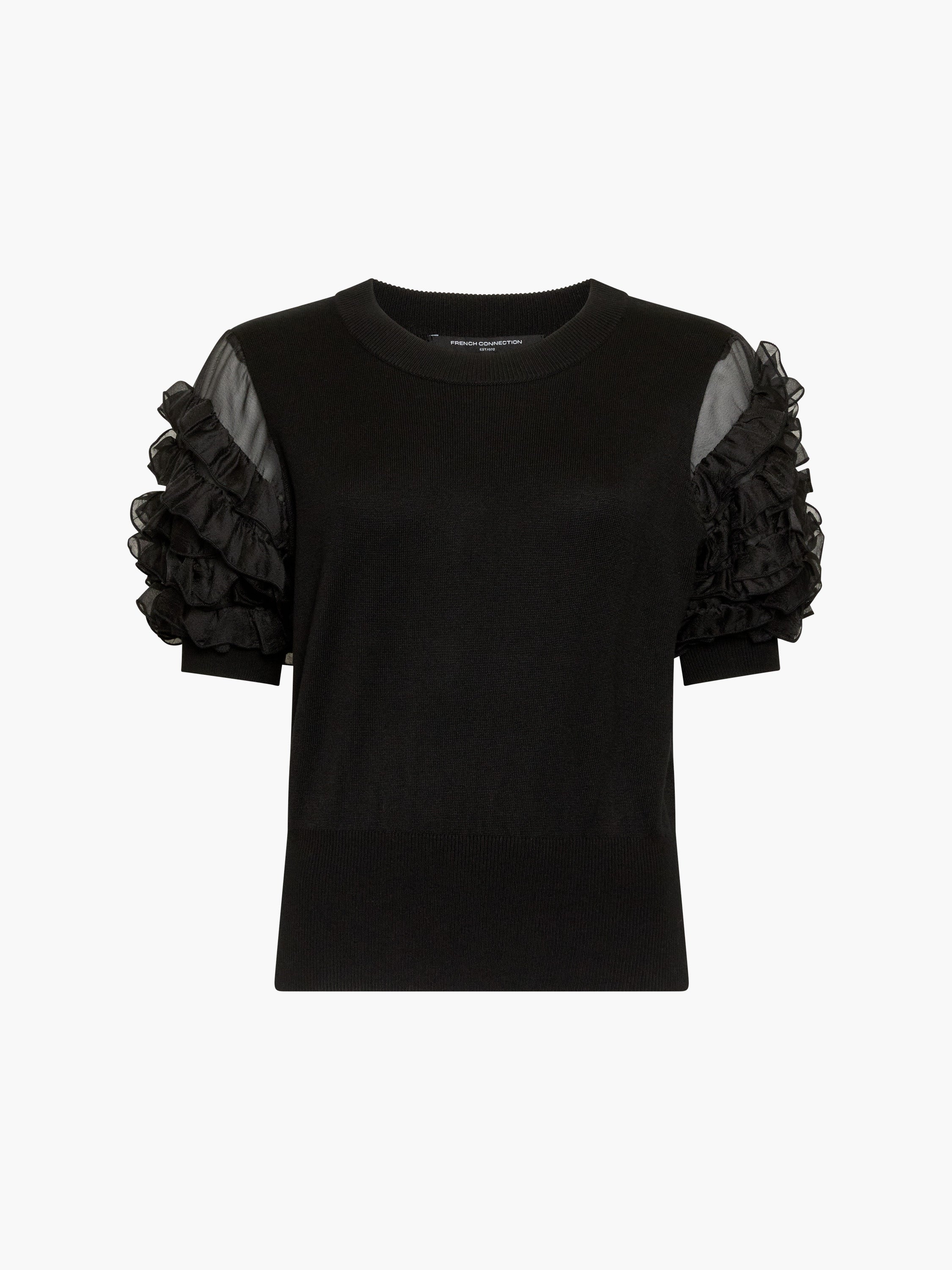 • Short sleeves with semi-sheer stacked ruffles and ribbed cuffs