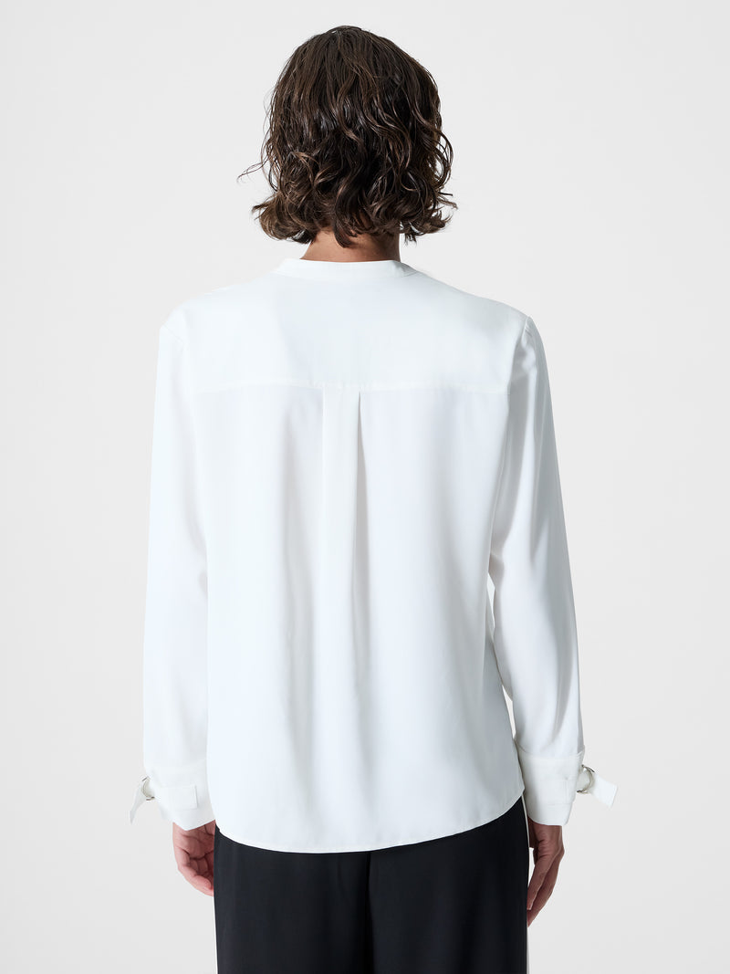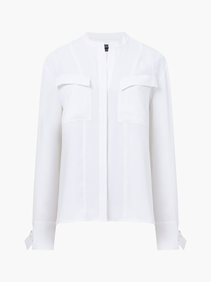 A fluid, modern update to the traditional white shirt. Our Mindy Collarless Long Sleeve Shirt redefines clean lines with a sleek band neckline, flap chest pockets and concealed buttons.