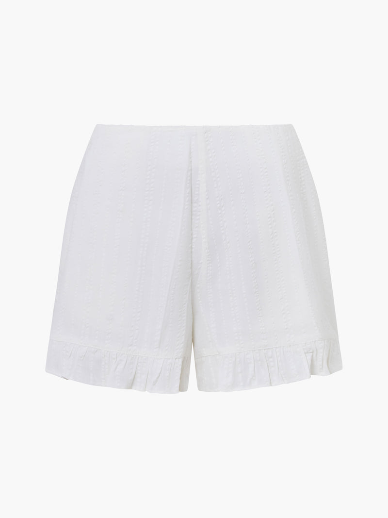Our Barnet Cotton Striped Shorts bring a touch of feminine charm to your wardrobe. These lightweight white shorts have a high rise silhouette, striped texturing, 2 side pockets and a ruffle hem.