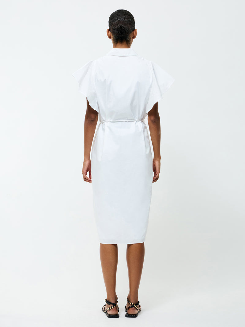Ready for anything. Our Cambria Cotton Belted Midi Dress pairs flutter sleeves with a soft collar, side pockets and self-tie metal trimmed belt.
