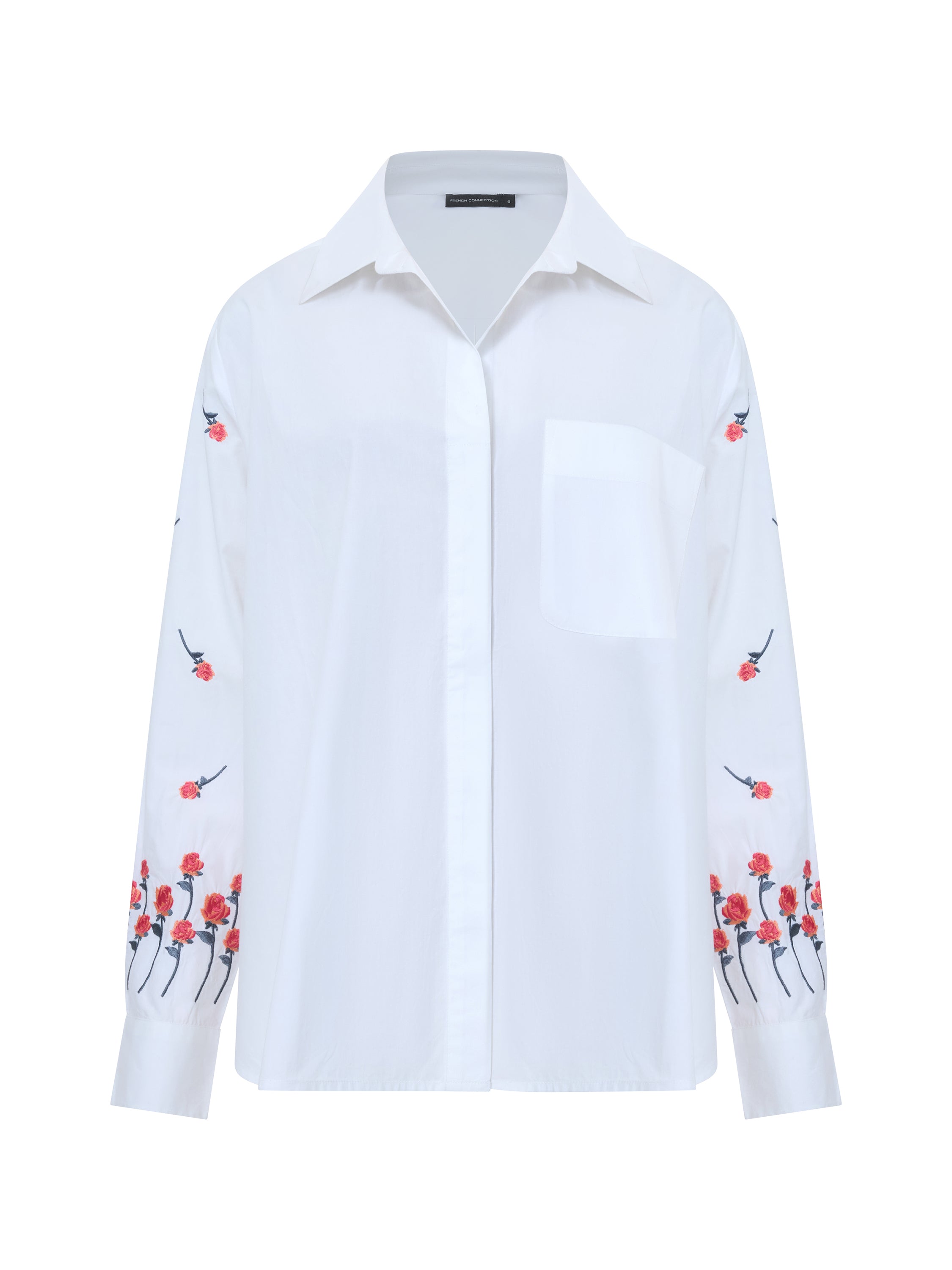 Our Embroidery Detailed Long Sleeve Shirt puts a feminine flourish on a fresh white shirt. This shirt is elevated by floral embroidery on its long sleeves, and has classic features from a refined collar and breast pocket to concealed button through fastening.
