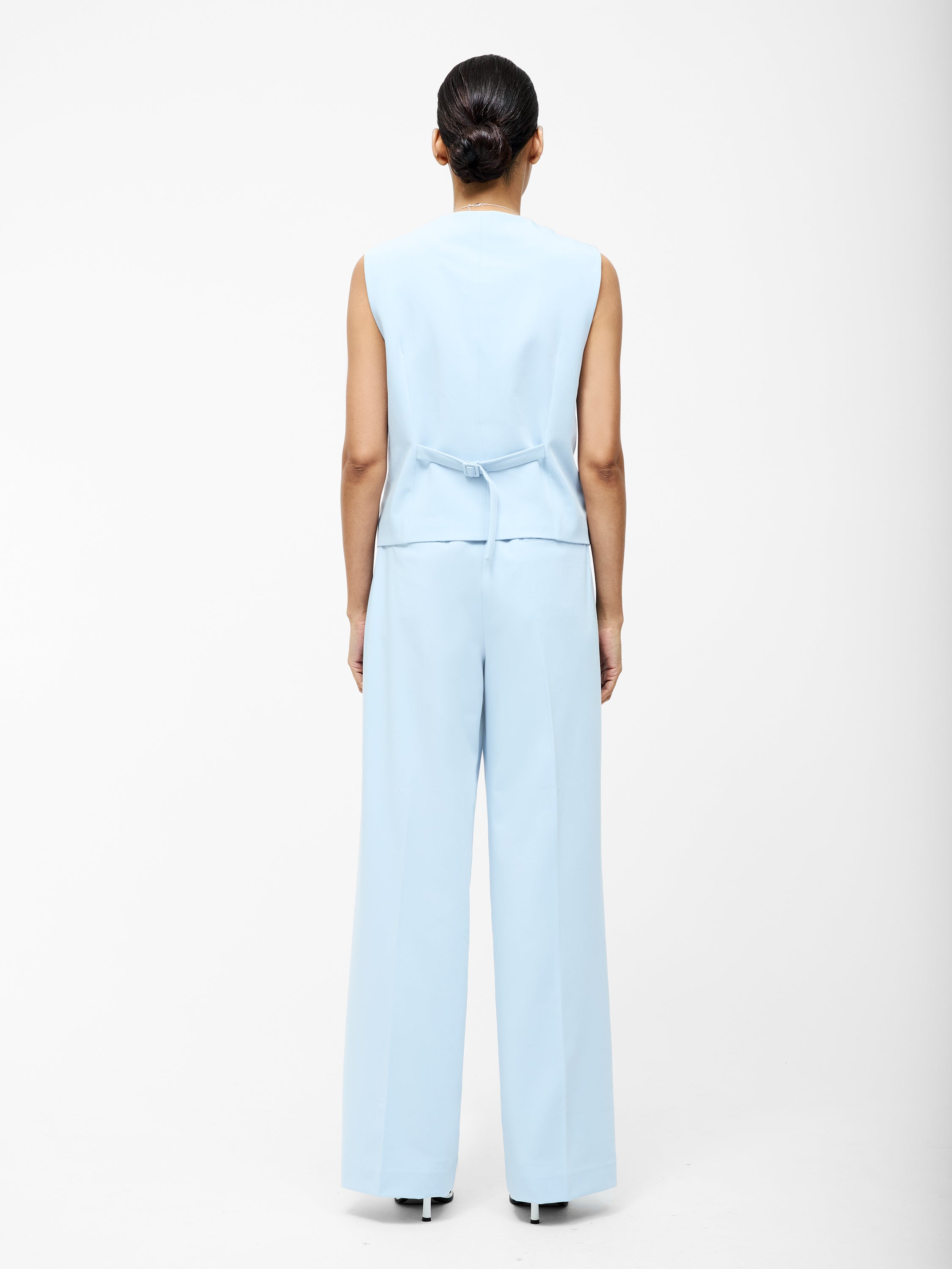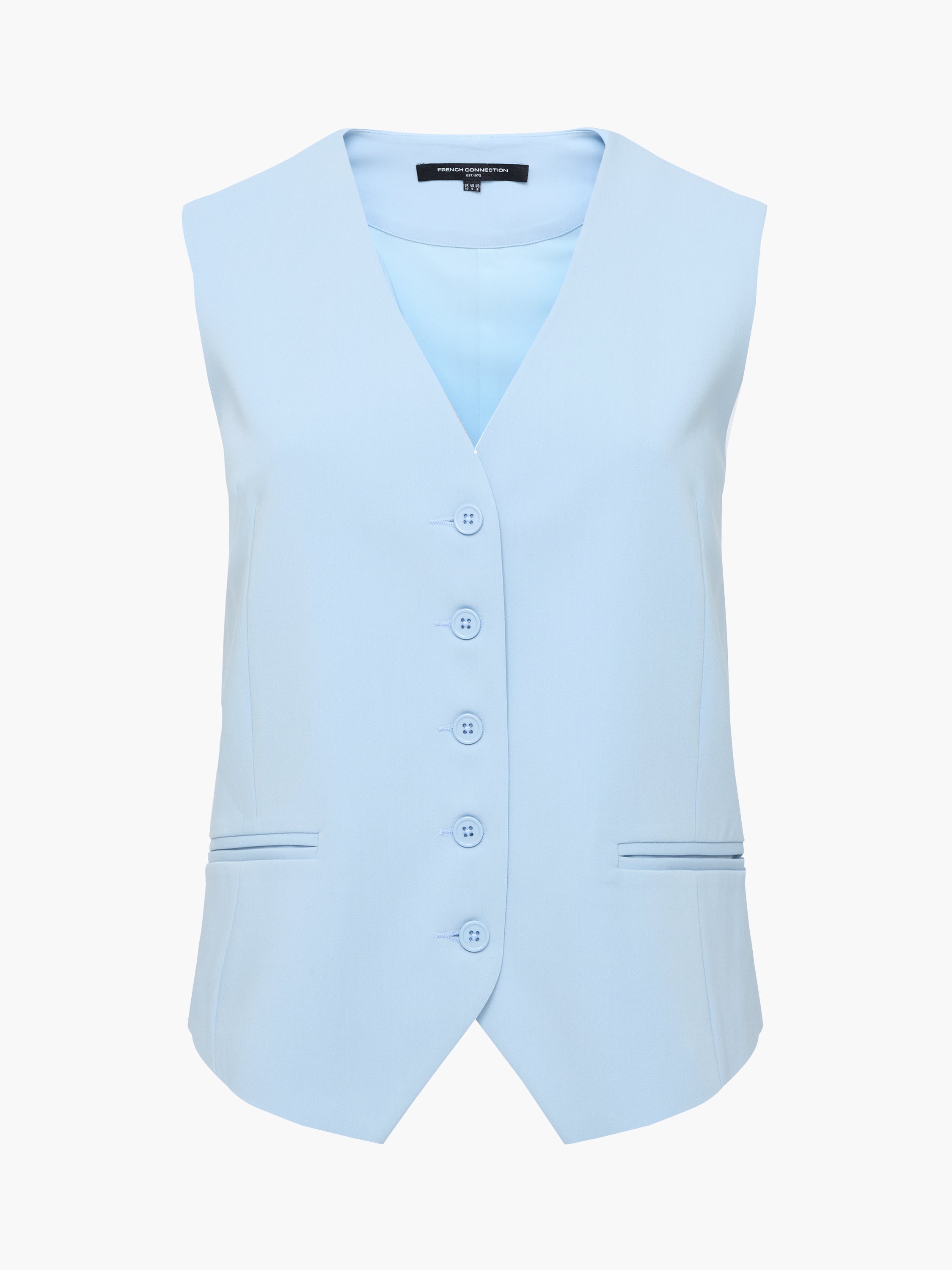 Chic suiting will never go out of style. Our Angie Tailored Waistcoat refreshes traditional tailoring in a pastel blue shade, faux welt pockets, button down fastening and back cinch.