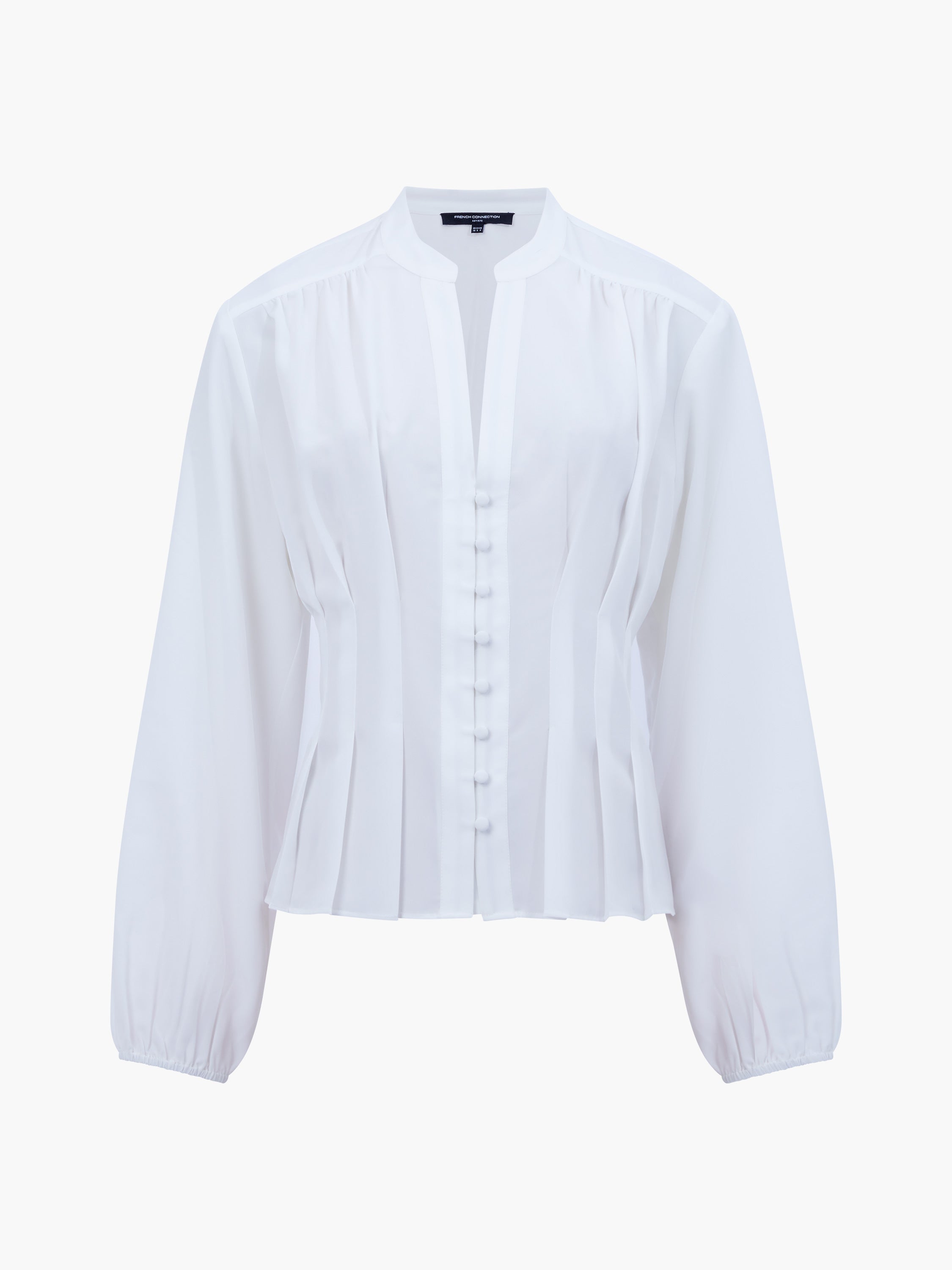 Our Capriana Crepe Pleat Button Down Top is your shortcut to polished style with a playful twist. Featuring sharp pleats, a button-down design,  a v-neckline with a mandarin collar and long puff sleeves.