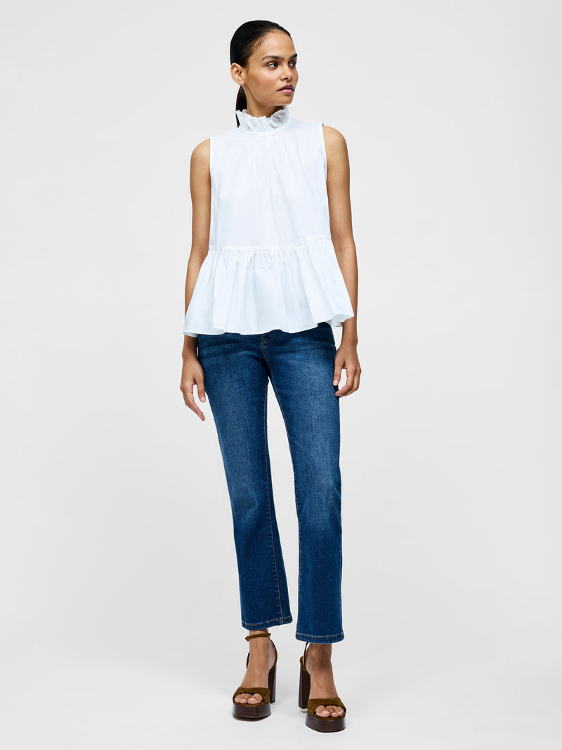 Start your wardrobe's summer love story with our High Neck Sleeveless Poplin Top. This sleeveless top stars in lightweight cotton, featuring a romantic frill neckline, tiered hem.