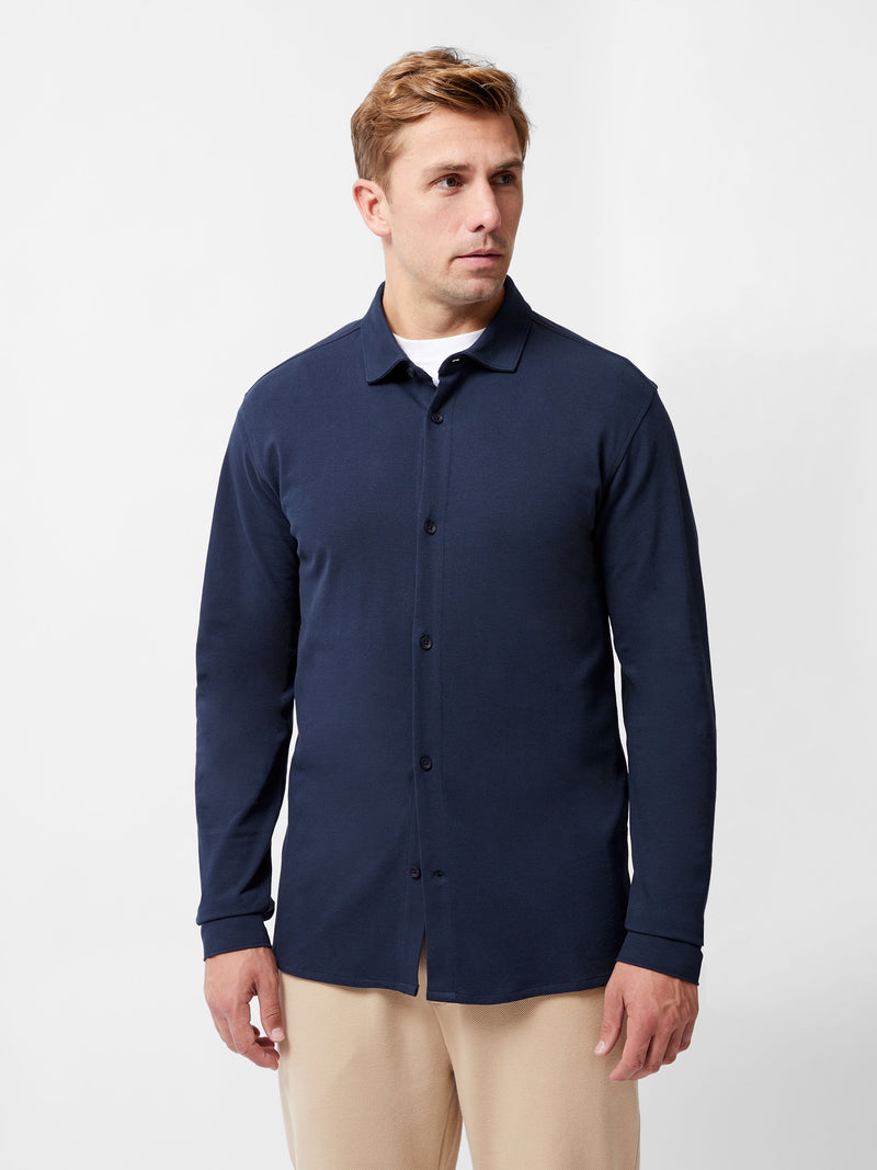 Our Long Sleeve Pique Jersey Shirt is your sharpest move in comfort-forward tailoring. Crafted in jersey with a pique texture, this long sleeve shirt features a refined collar and button down front.