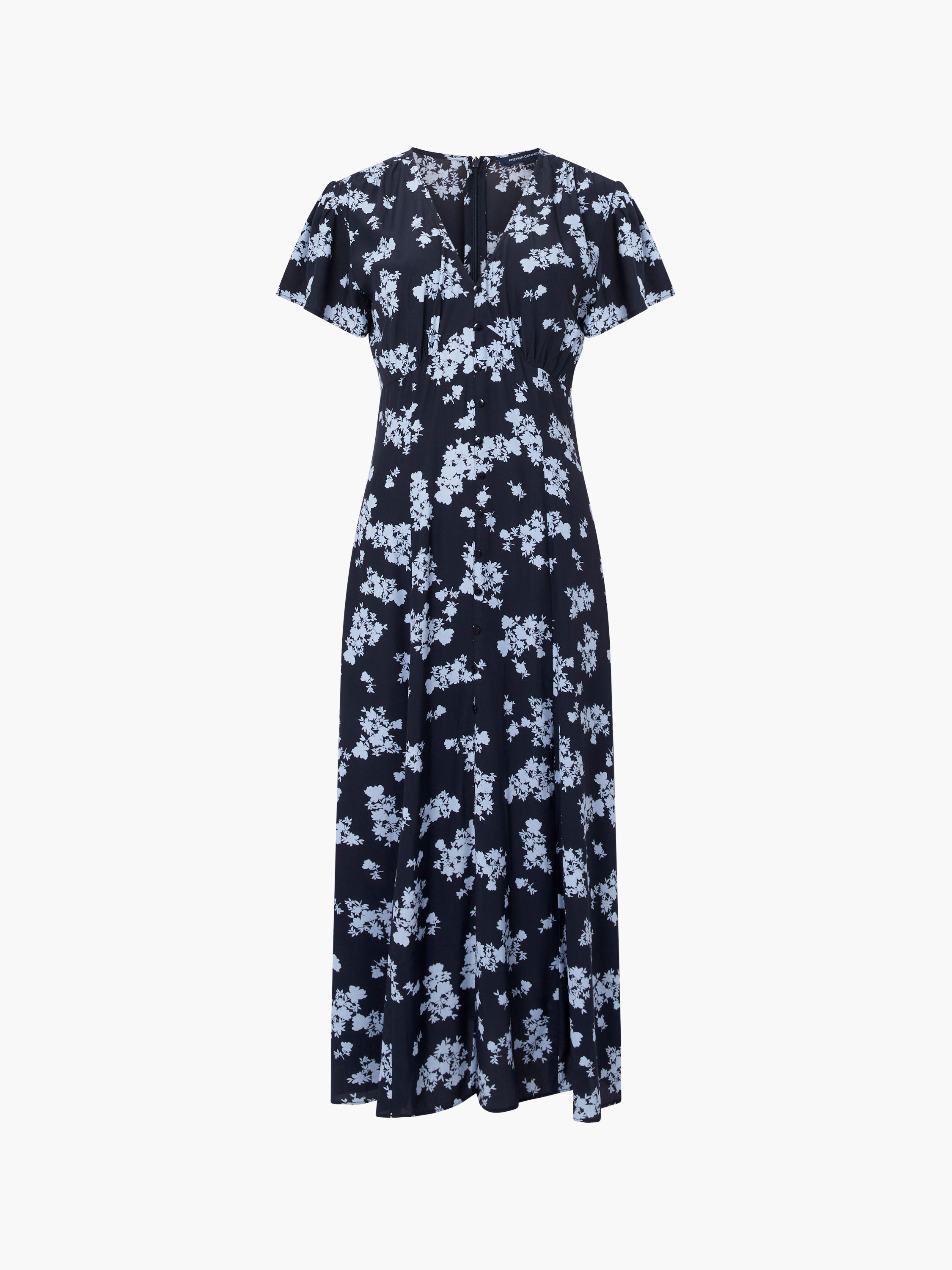 Float into the season with this beautiful floral dress. Our Raquel Flutter Sleeve V Neck Midi Dress has flutter sleeves and an empire waist, a v neckline and faux button details.