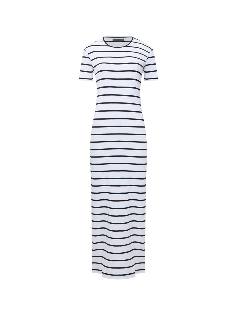 Your wardrobe will be seeing stripes with this casual summer dress addition. Our Ribbed Striped Midi Dress features contrasting stripes across a soft, ribbed and short sleeved body, complete with a playful side slit.